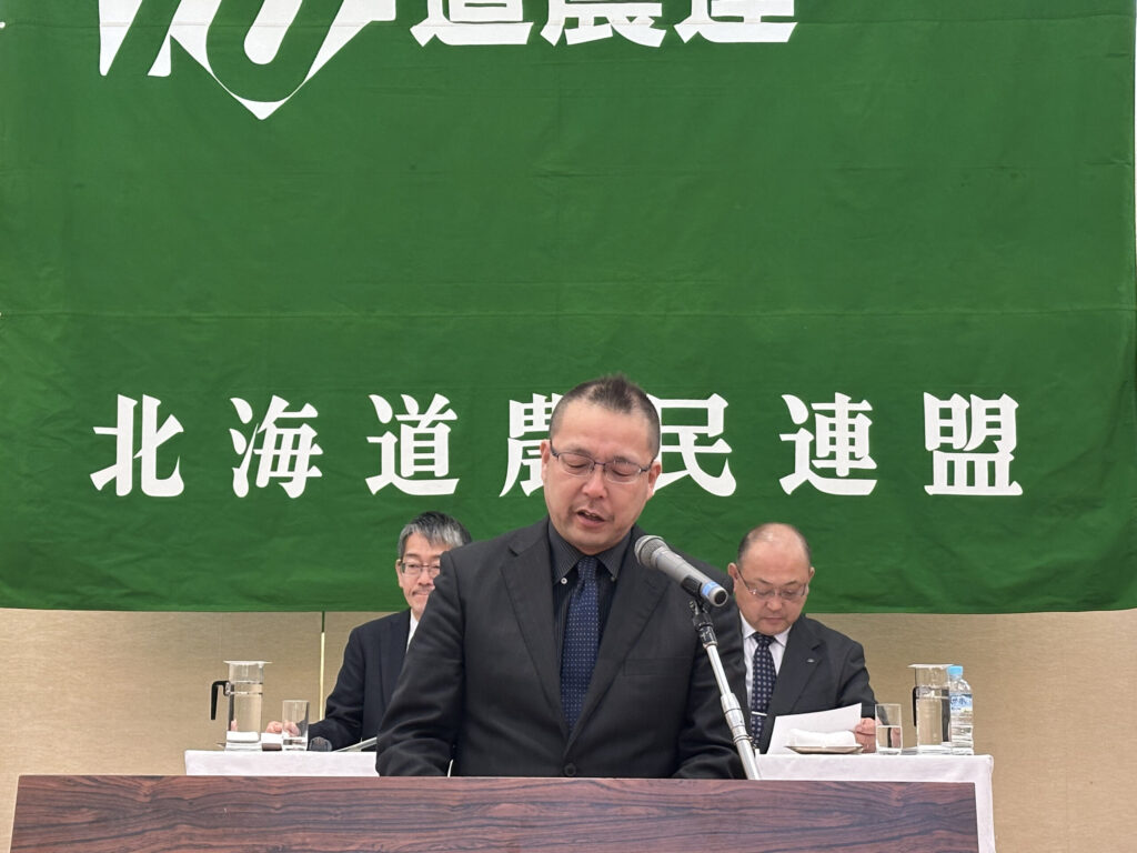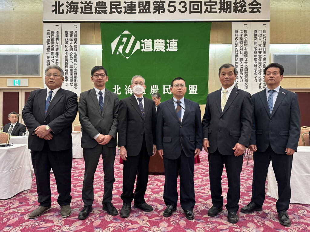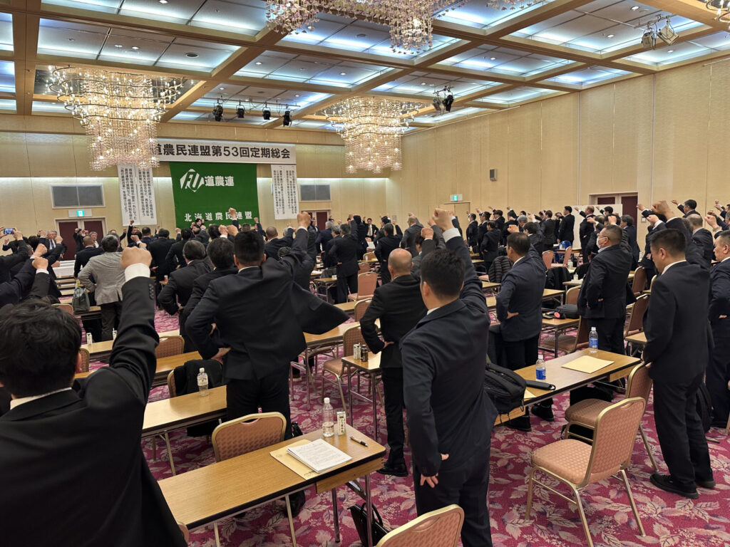 道農連は2月12~13日(木~金)、札幌サンプラザで第53回定期総会を開催し、全道の地区・市町村組織の代議員ら約120名が参加しました。総会では、4本のスローガンを確認するとともに、2025年度活動報告及び収支決算、2026年度運動方針及び予算案が満場の拍手で了承されました。